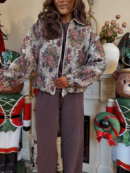 Vintage Rose Tapestry Zip-Up Bomber Jacket