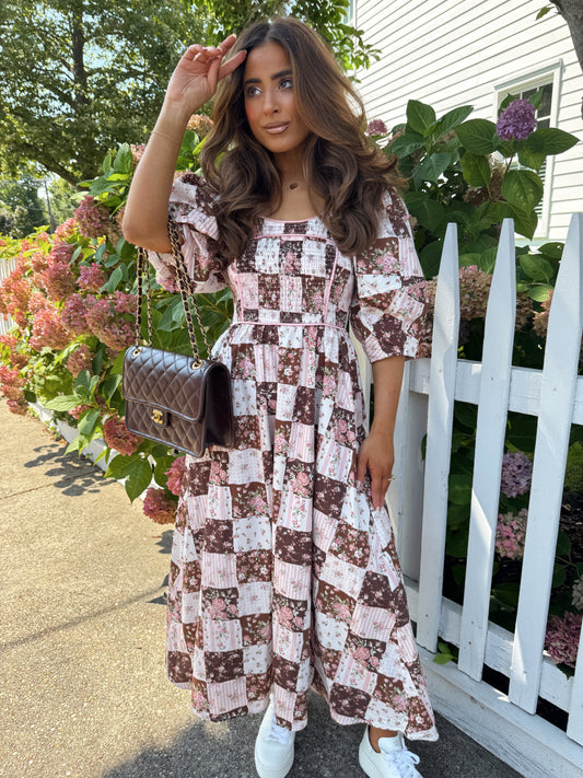 Strawberries 🍓 & Mocha Puff Sleeve Midi PRE ORDER SEPTEMBER