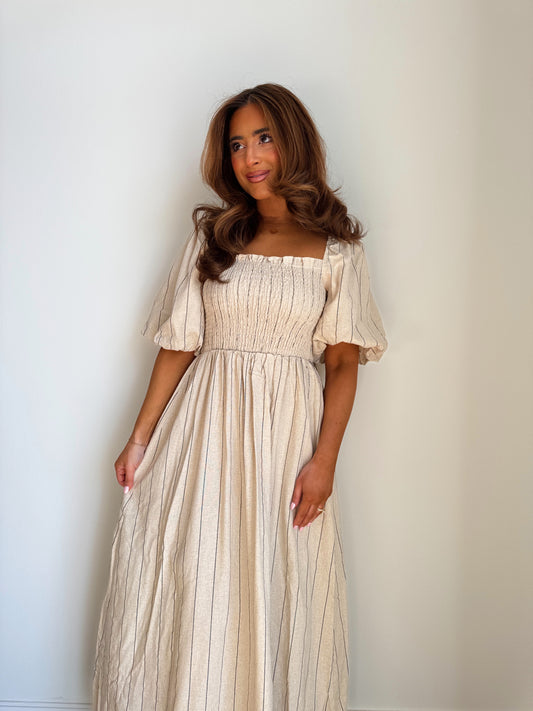 Lillian Linen Striped Puff Sleeve Midi Dress