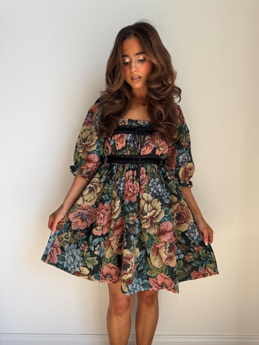 Floral Jacquard Puff Sleeve Mini Dress
