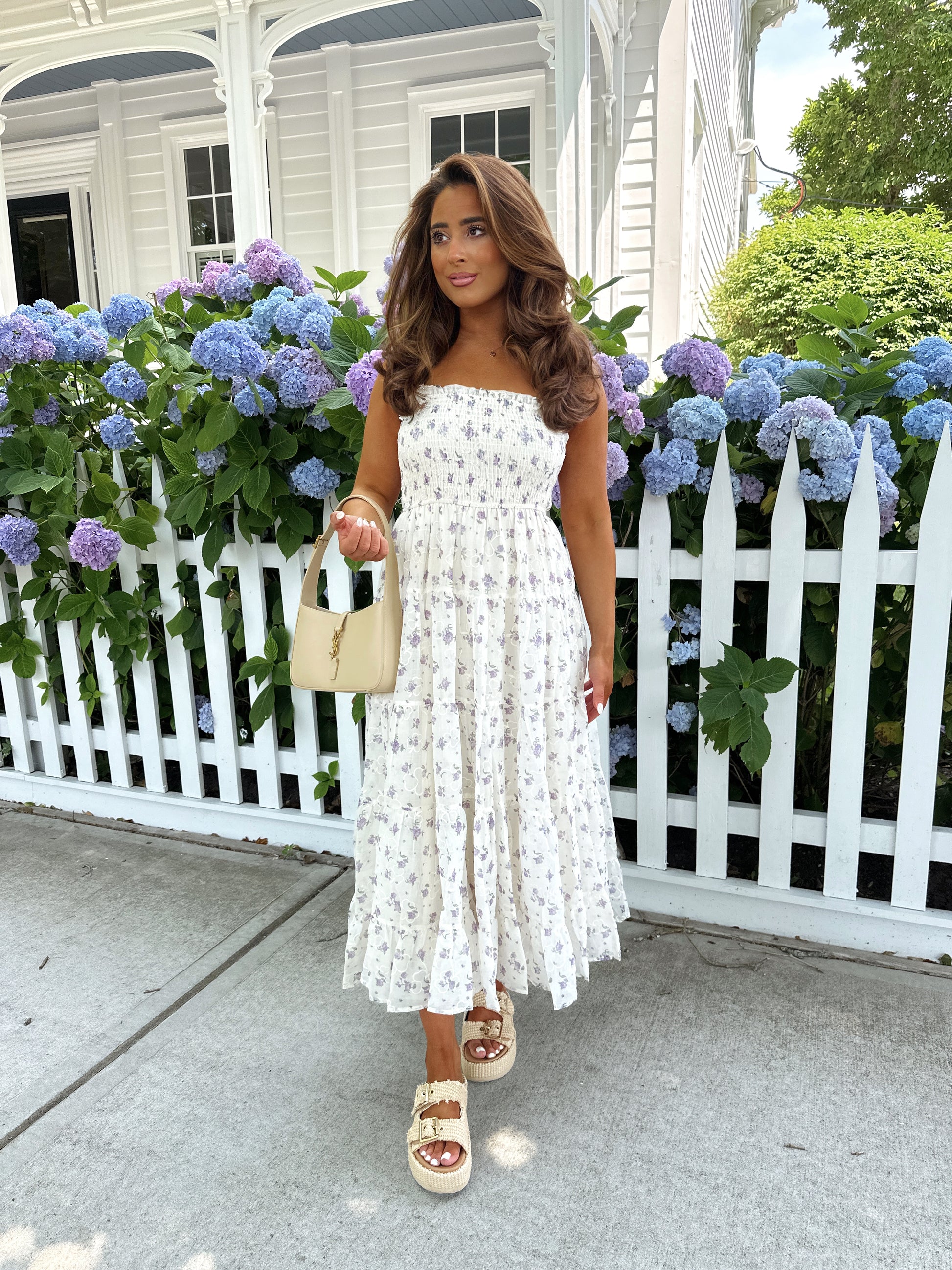 This charming floral dress features delicate straps and a beautifully smocked top that hugs your figure for a flattering fit. The dress flows gracefully with its lightweight fabric, adorned with a vibrant floral print that adds a touch of elegance and freshness to your look. Perfect for warm weather, this dress is ideal for casual outings, picnics, or garden parties, offering both comfort and style.