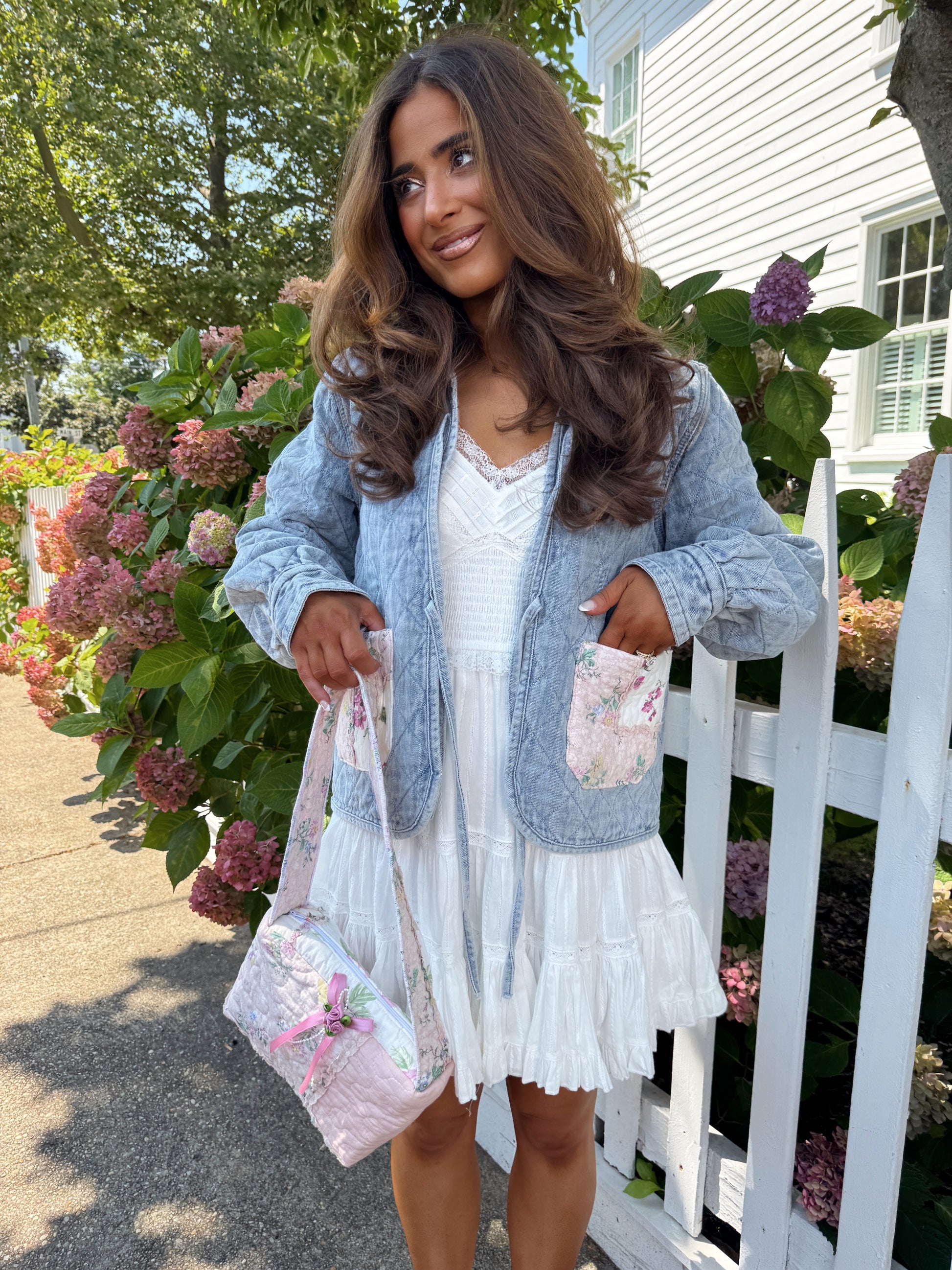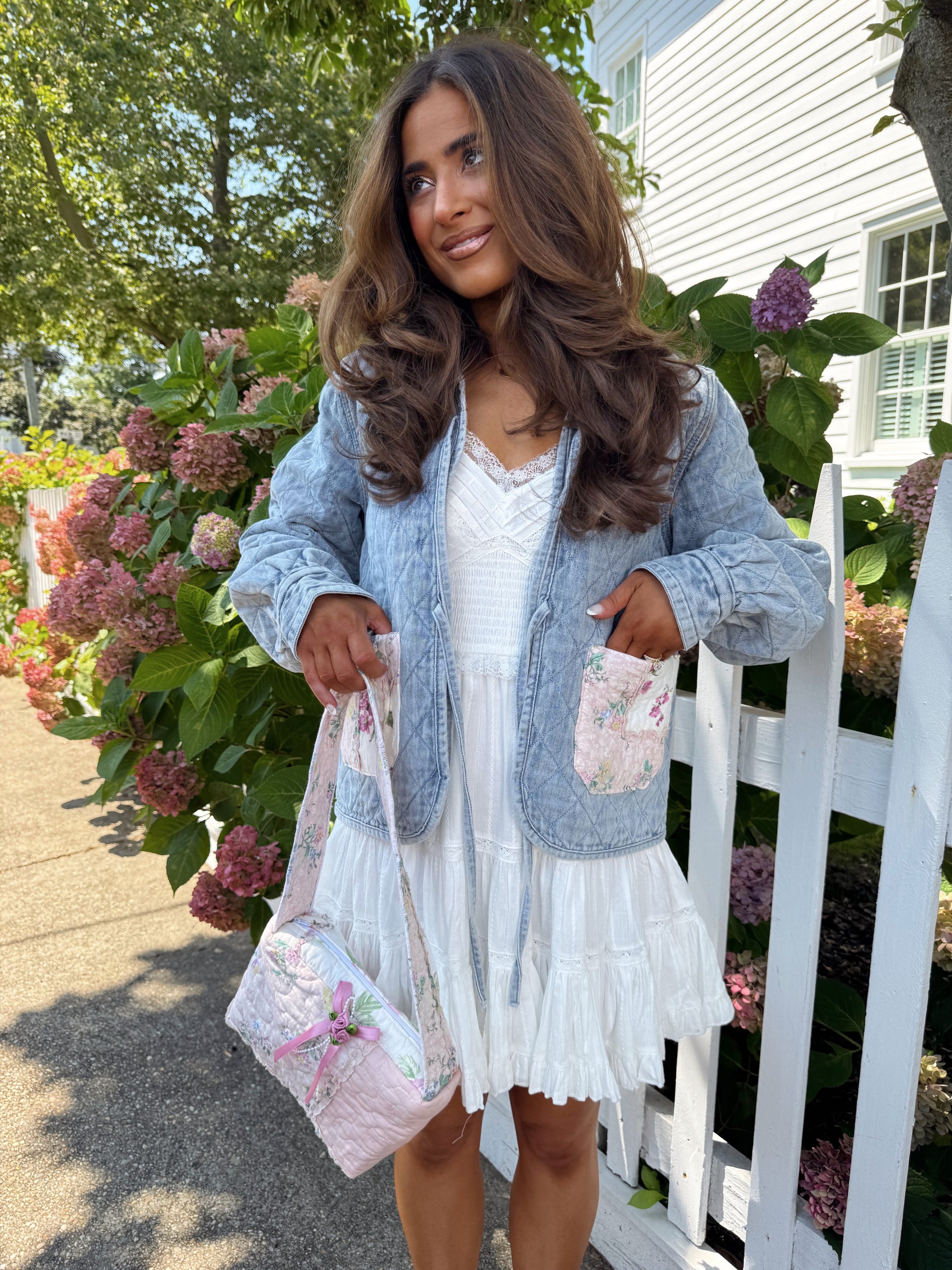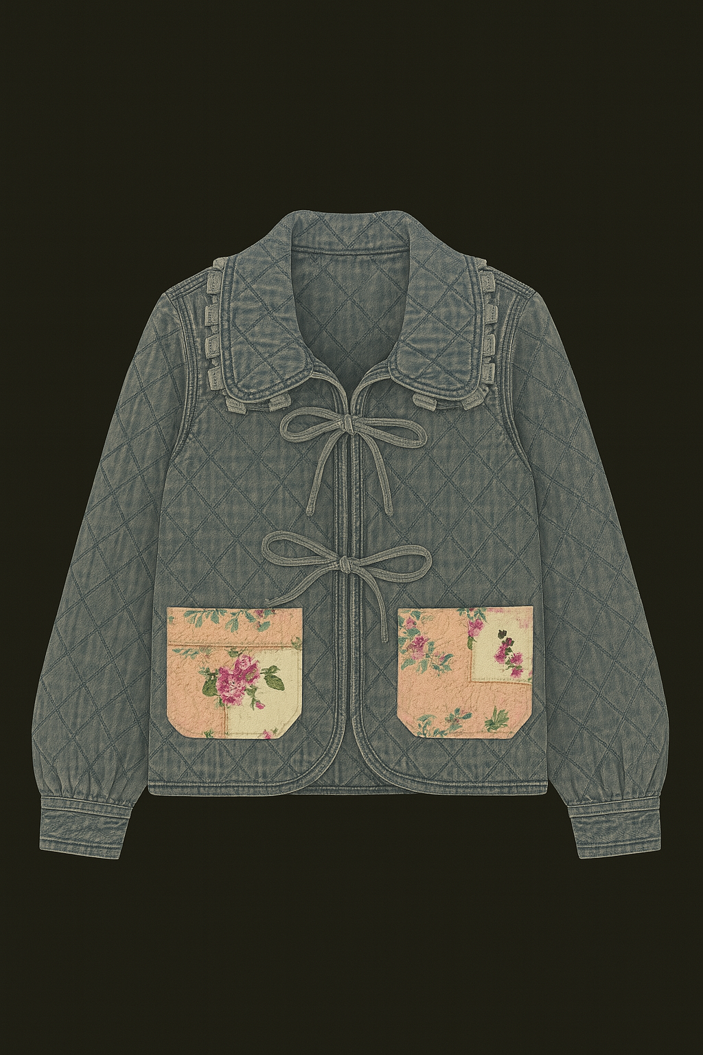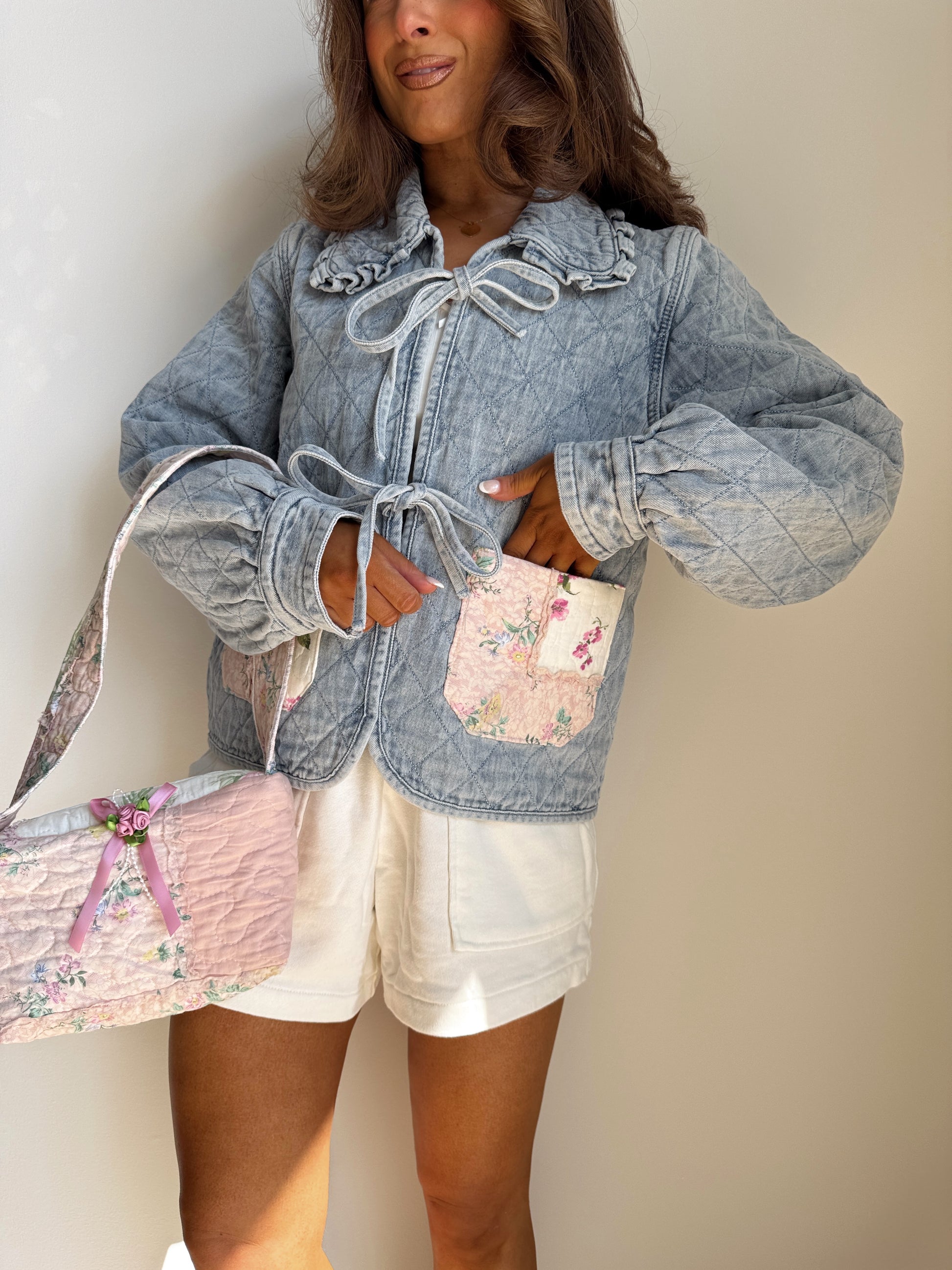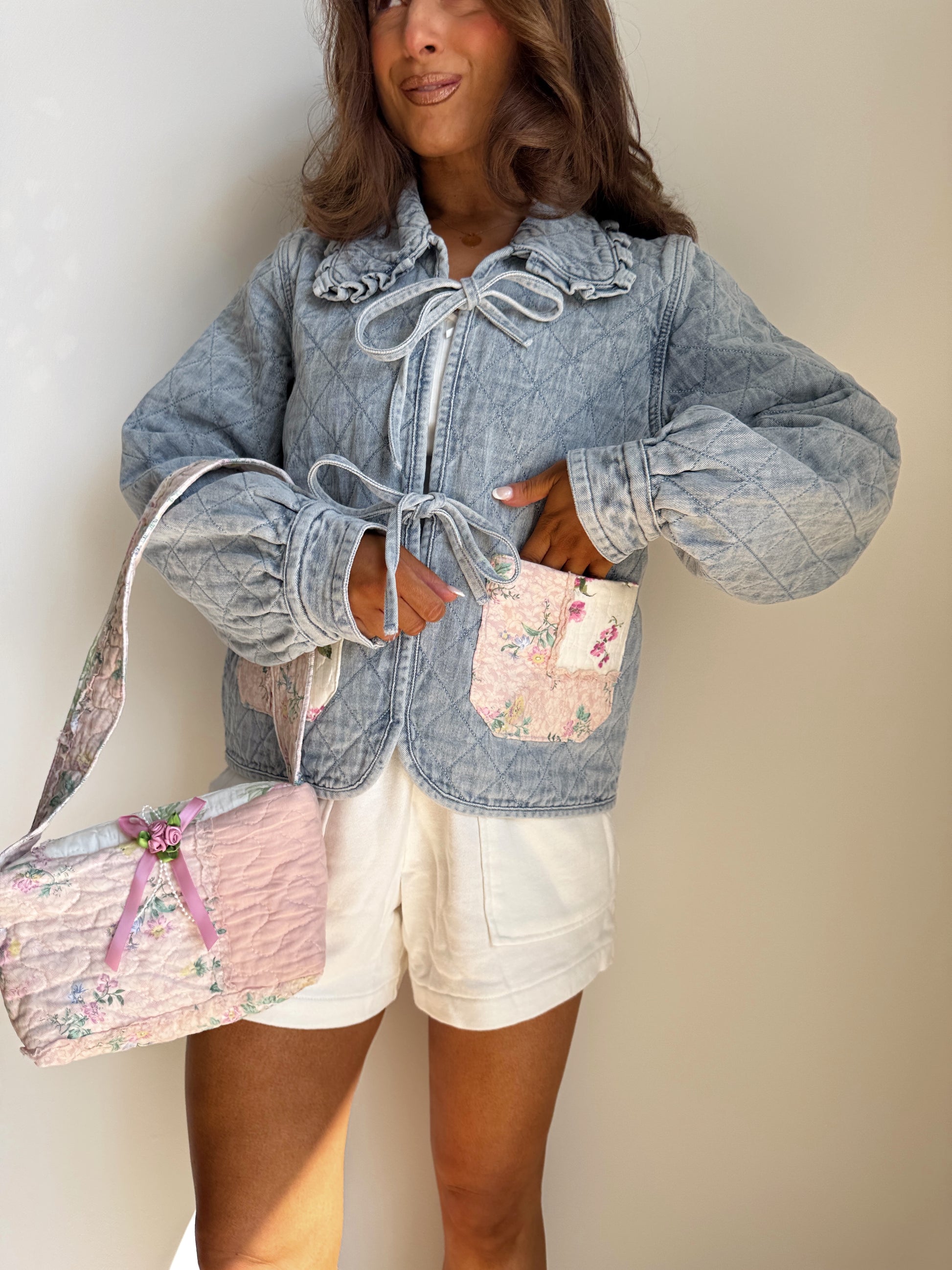 This gorgeous handmade coquette denim jacket with vintage fabrics on the pockets is perfect for fall!
