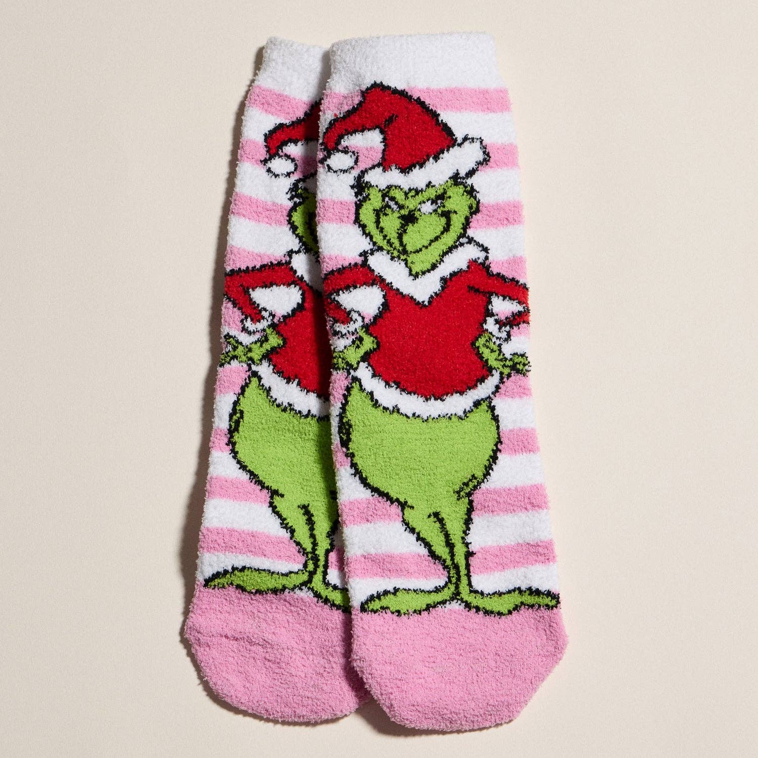 Celebrate cozy holiday vibes with this fun and festive sock gift set featuring four ultra-soft pairs of socks. Each pair showcases playful pink, white, and green accents with unique seasonal designs — including the iconic green monster in holiday attire, pink checkered patterns with bows, and charming ornaments. Perfect for gifting or keeping your own toes toasty, this set adds a cheerful twist to your winter wardrobe.