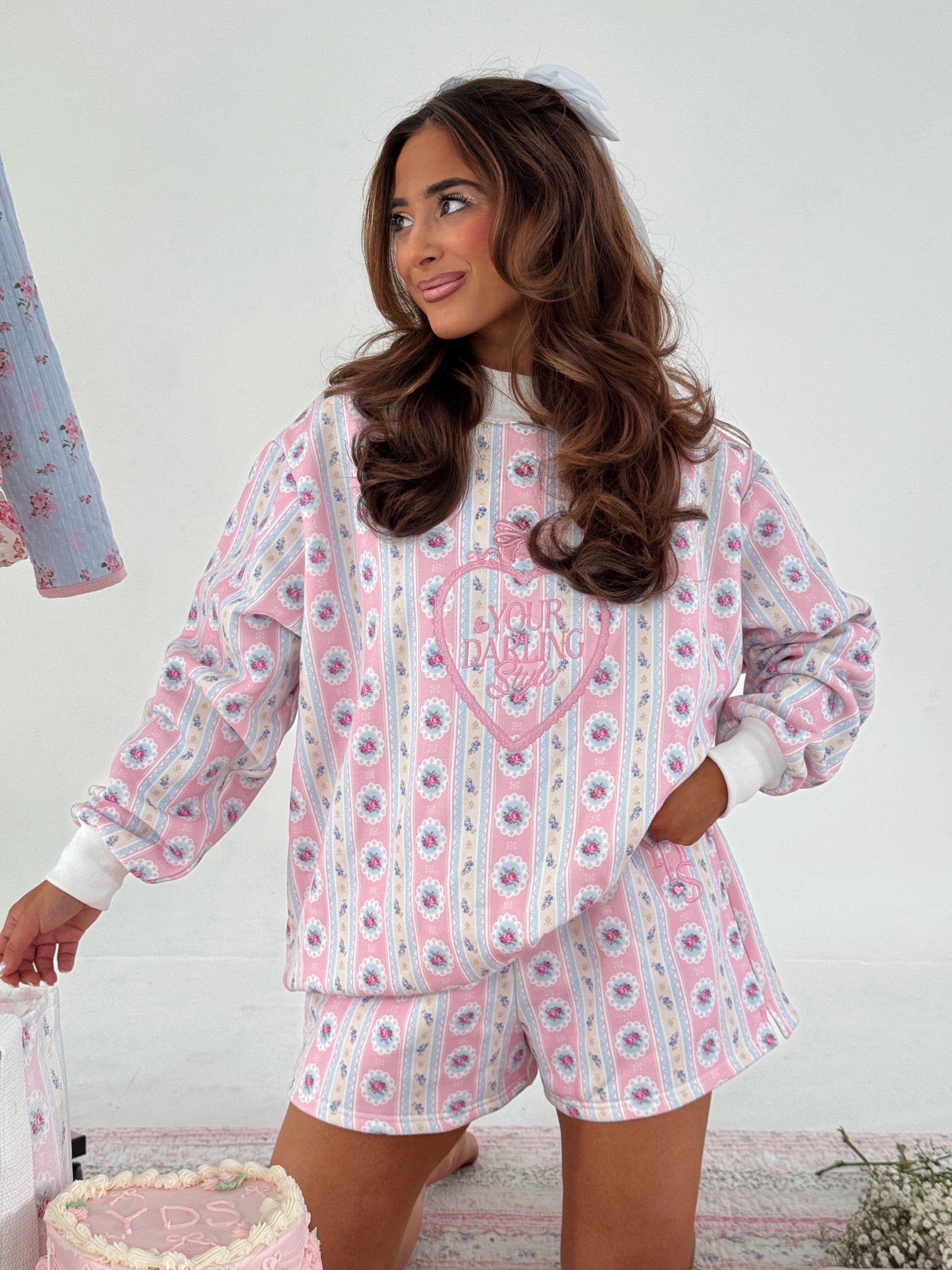 Step into sweetness with our exclusive Your Darling Style custom lounge set. Designed in-house and created with the softest, coziest fabric, this set features our signature pastel stripe pattern adorned with delicate floral motifs. The top includes our embroidered heart logo with a bow detail, celebrating everything feminine, timeless, and darling.