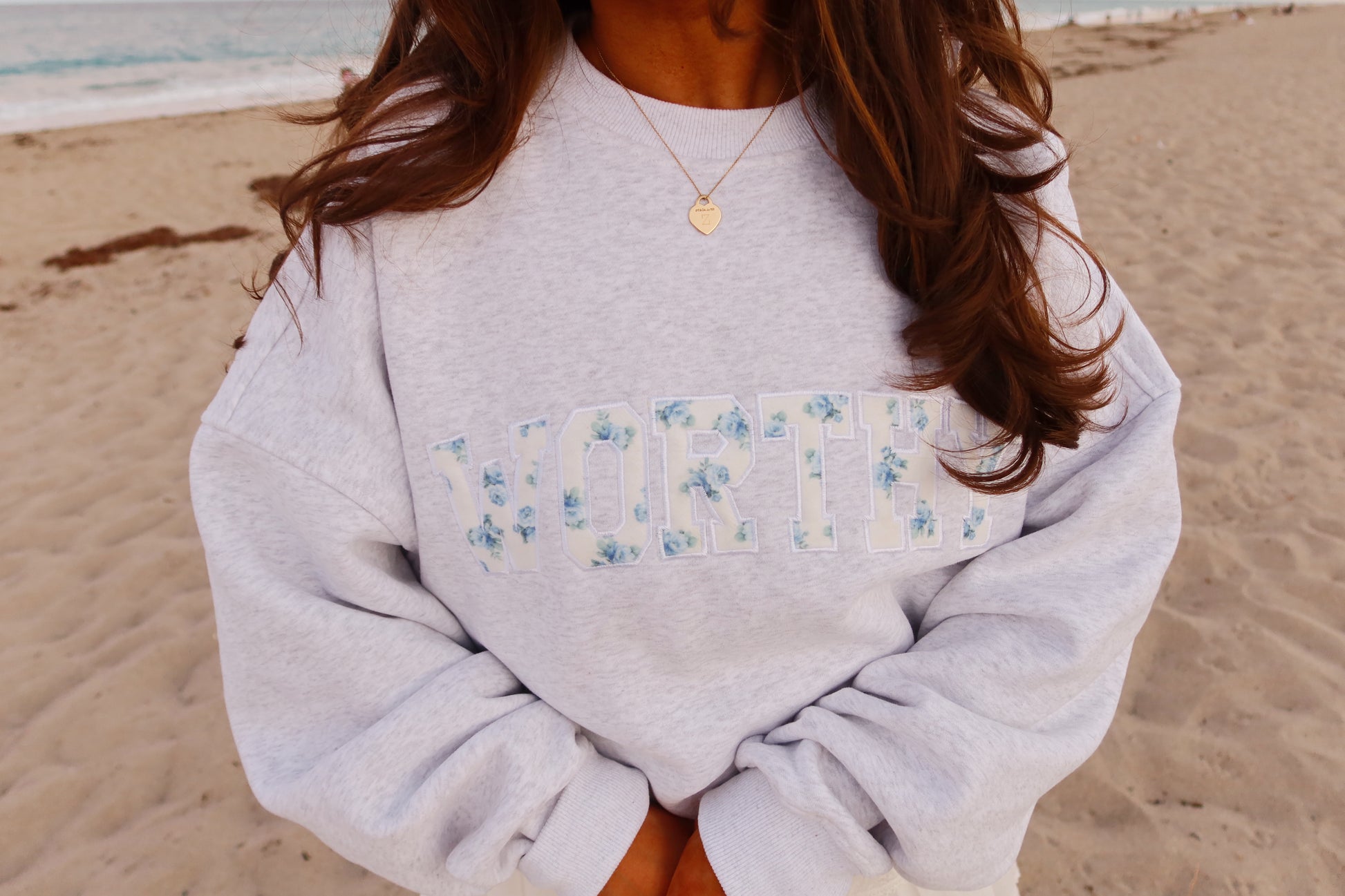 Embroidery Details: WORTHY ON FRONT with floral filled print